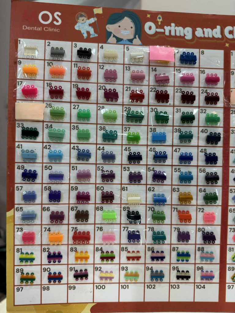 ยางโอริง (O-Ring): คือยางวงเล็กๆ ที่ใช้ใส่บนแบร็กเก็ตแต่ละซี่ มีหน้าที่หลักคือการยึดลวดจัดฟันให้อยู่ในร่องของแบร็กเก็ต เพื่อให้ลวดสามารถส่งแรงเคลื่อนฟันได้อย่างมีประสิทธิภาพ โอริงมีสีสันให้เลือกมากมายและเป็นสิ่งที่เราเลือกเปลี่ยนกันทุกเดือน