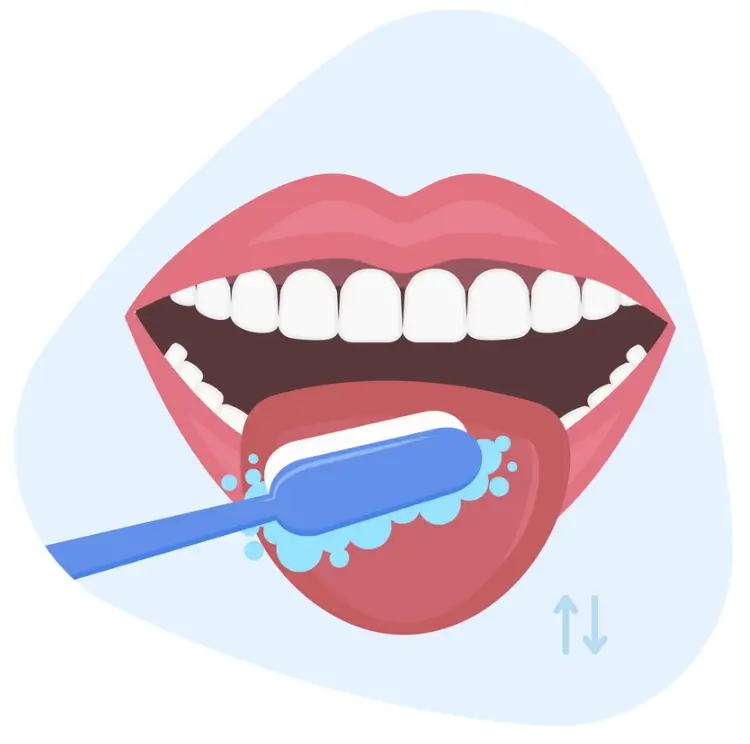 ขั้นตอนที่ 5 – แปรงลิ้นและกระพุ้งแก้ม เพื่อกำจัดคราบจุลินทรีย์และกลิ่นปากบริเวณดังกล่าวออก